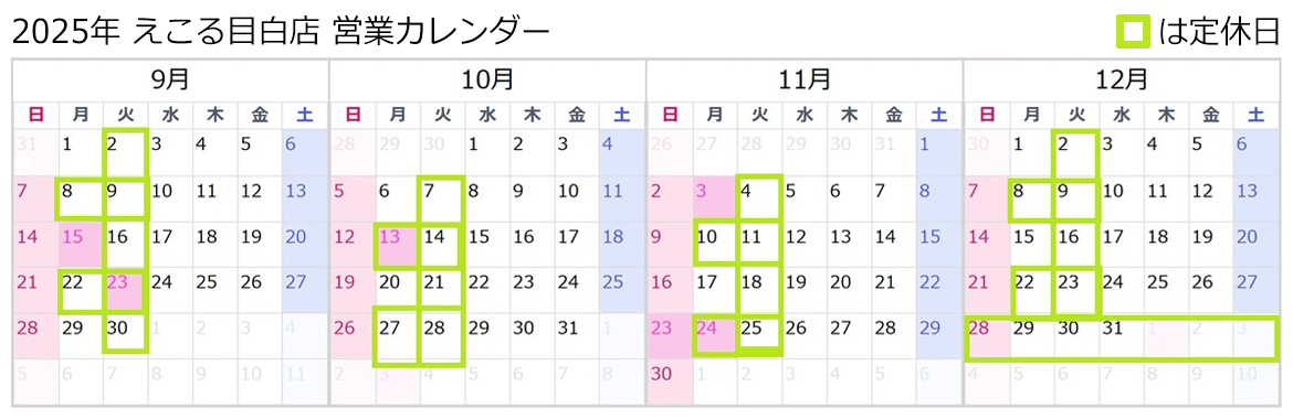 店舗スタッフの高齢化や健康上の理由により、2025年9月から従来の火曜定休に加え、隔週で週休二日制とさせていただきますのでお知らせ致します。